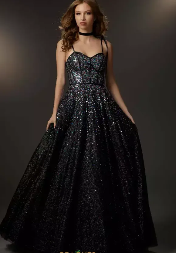 Steal the show in captivating ball gown dress 48024 by Morilee. This dress is memorable with a fit and flare silhouette that is ideal for all body types. The corset bodice features contrasting glitter that makes a striking transition onto the glittering voluminous tulle skirt giving you the perfect amount of sparkle.