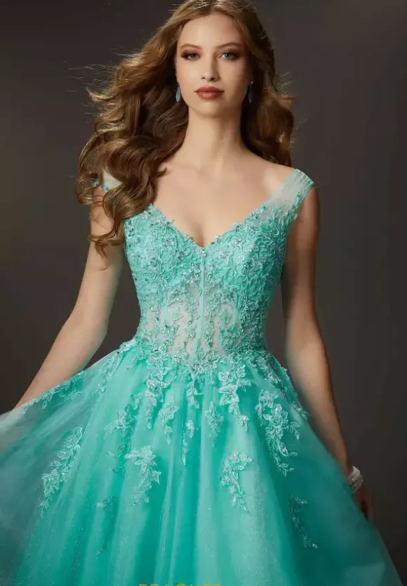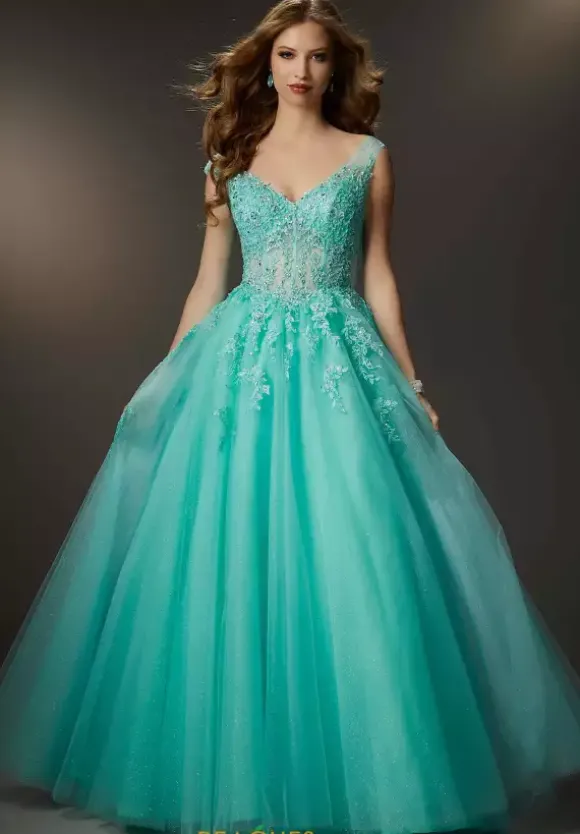 Have a true fairy tale moment in this ball gown Morilee dress 48035. This tulle dress had an unique sheer illusion bodice with a v neckline and thick off the shoulder straps. Striking lace appliques amp up the glam factor throughout the bodice and trickle down the top of the layered tulle ball gown skirt.