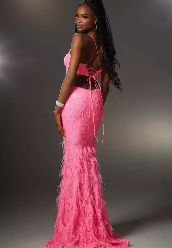 Step out of your comfort zone in this fun and flirty Moriless long dress 48039. Featuring a v neckline with simple straps that gracefully make their way along the back into a corset lace up. Fitted long dress is beautifully adorned with lovely applique long the fitted bodice and is complemented by chic feathers along the fitted skirt.