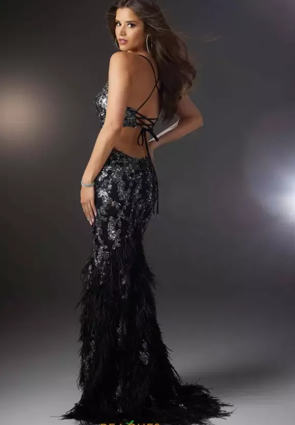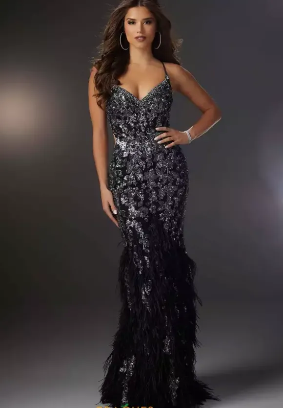 Step out of your comfort zone in this chic long dress 48074 by Morilee. Show stopping fitted dress reveals a modest v neckline with simple straps that gracefully fall along the back into the corset lace up. Entirely adorned with eye catching embroidery and trendy feathers along the bottom of the fitted skirt, this stunning long dress definitely screams glamorous.