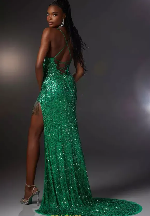 Turn heads and drop jaws when you step into the room wearing shimmering and vibrant long dress 48077 by Morilee. The fitted silhouette is perfect for anyone who wants to effortlessly flatter their figure while being able to cinch and adjust it to their liking with the adjustable lace up closure that is featured behind the bodice. Glistening sequins adorn the entirety of the dress while dramatic fringe beads rattle and shimmer as you strut. Make a show stopping exit with an open thigh high slit and sweep train.