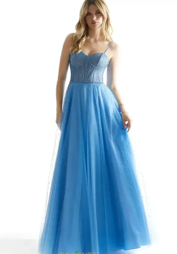 Feel like a modern day princess in this enchanting long dress by Morilee, style 49004. Featuring an a-line silhouette with a sweetheart neckline thats adorned with two delicate straps that lead to a lace up back. The corset bodice is fully adorned with glistening beadwork that cascade down the tulle skirt.