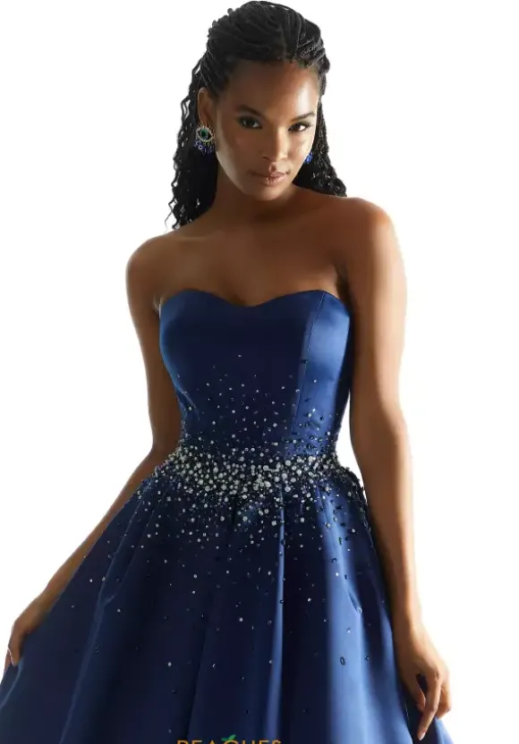 Look like royalty in this satin Morilee ball gown dress 49054. A strapless sweetheart neckline is featured on the fitted bodice while glistening beads adorn the small of your waist and scatter evenly onto the fitted bodice and voluminous satin skirt that is completed with pockets and a classic sweep train.