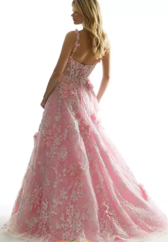 Twirl the night away in this delightful Morilee a line gown 49072. Charming and charismatic, this lovely gown features an ultra chic scoop neckline and beautiful dainty straps with floral appliques that add a romantic edge. Gleaming appliques adorn the corset bodice and gracefully cascades onto the playful tulle a line skirt. Shimmering stones and three dimensional floral detailing add an enchanting touch.