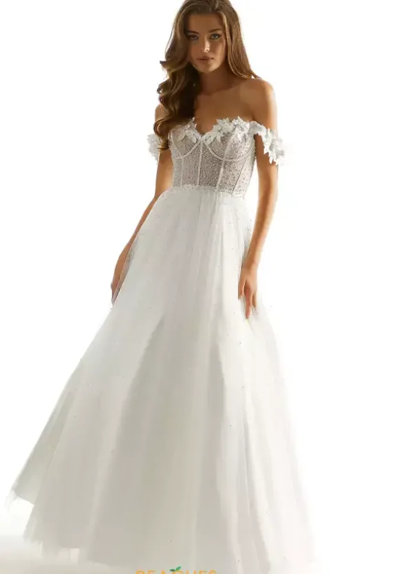 Look picture perfect at your prom wearing this absolutely gorgeous Morilee long prom dress style 49075 made in both beaded tulle and sparkle tulle layers. This scintillating silhouette showcases a structured sheer corset bodice adorned with pearls and 3D floral appliques with beaded exposed boning, sweetheart neckline and off the should cap sleeves. The a line, long ball gown skirt sparkles endlessly with pearl and crystal beading.