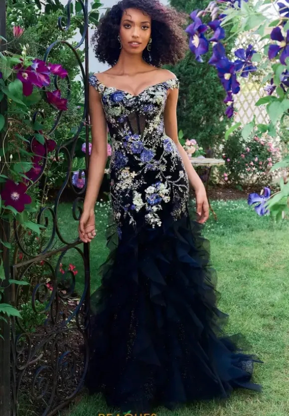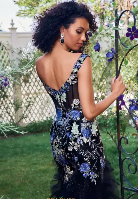 Show off your unique sense of style in this one of a kind long dress by Morilee style number 49148. This fun and flirty dress features a classic off the shoulder V neckline with cap sleeves. The bodice has a classic corset with a back zipper and sheer panels on the front. The whole gown is adorned in floral applique and the skirt has tulle ruffles as well as a mini sweep train.