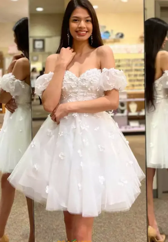 Beautiful short dress 9581 by Morilee is a must have. This strapless sweetheart neckline dress showcases a three dimensional floral detail that trims the neckline of the top. The back clasp together giving you a key hole opening. Detachable off the shoulder cap sleeves give you a two in one look. Sparkling glitter tulle make the skirt flare out just perfectly.