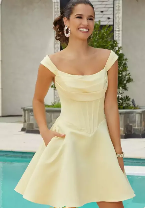 Look and feel like a modern day princess wearing this elegant short dress 9615 by Morilee Damas. This darling style is made with a flattering satin material that showcases a subtle shine. The corset style bodice has exposed boning and a layered scoop neckline. Modest off the shoulder sleeves wrap into a semi open back.
