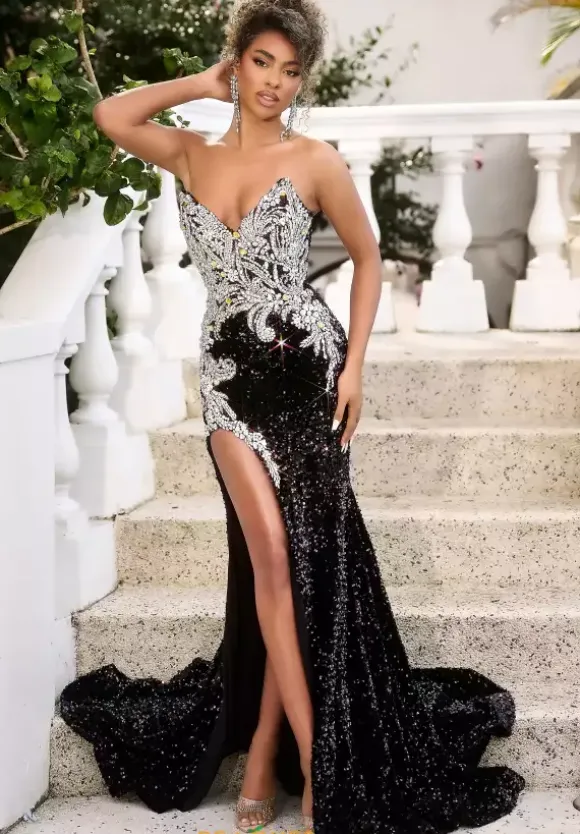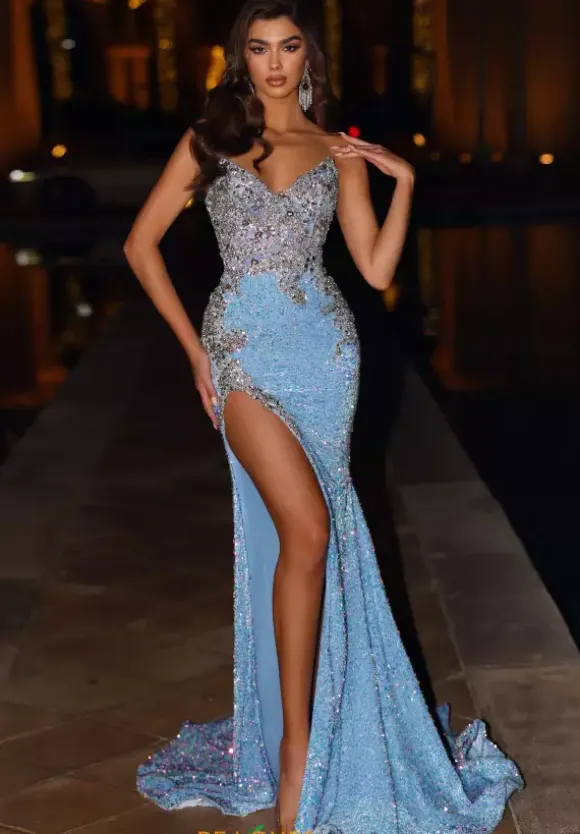 Make a statement in extravagant long dress PS23645 by Portia and Scarlett. The off the shoulder V neckline displays lavish beaded patterns that make a stunning transition throughout the fitted bodice lining the top of the thigh high slit. Radiant sequins have been sewn to perfection to have all eyes on you as you strut revealing your extravagant sweep train.