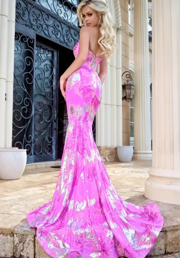 Be pretty this prom season with this eye catching Portia and Scarlett long prom dress PS24319. From the strapless V neckline down to the elegant sweep train, this trendy fitted dress is adorned in head turning patterns from sequins and beads that exude a shine and pattern that will not go unnoticed.