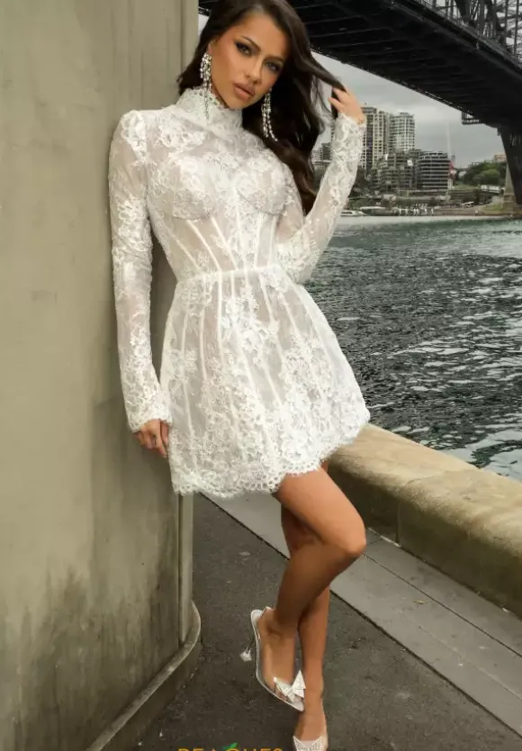 Mesmerize all those in sight in this fascinating short Portia and Scarlett dress PS24424. Exude confidence in this ravishing style that features a high neckline with edgy long sleeves. Made in a delicate lace fabric, beautiful appliques adorn the entire ensemble highlighting a lavish scalloped trimming.