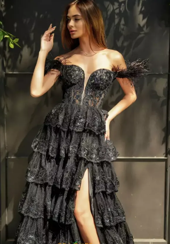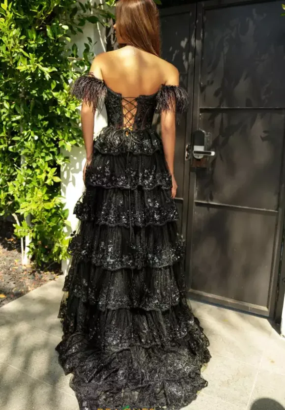 Exude elegance in this lavish Portia and Scarlett A-line dress PS24525. Cinch and adjust the fitted corset bodice to your liking with the corset lace up closure on the back and feel fierce with a plunging V-neckline that pairs gorgeously with the off the shoulder feather cap sleeves. At the hem of each tulle layer on the skirt, glittering sequins are featured for a radiant black sparkle.