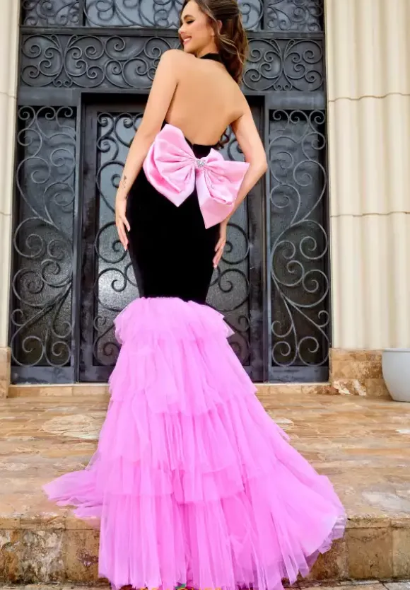 Be the hottest topic as well as the standout at your event when you wear this never before seen Portia and Scarlett prom dress PS24680. The fitted silhouette is made from a soft black velvet fabric and features a plunging V-halter neckline along with a sexy open back that features a pink bow embellishment to match the pink tulle layered sweep train.