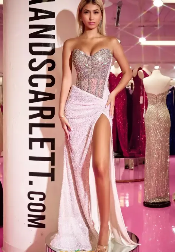 Look ready to attend the met gala in this extra glamorous, eye catching long Portia and Scarlett gown style PS24850C. Showcasing a strapless sweetheart neckline adorning the flattering corset bodice. This full shimmer gown is perfect to have you stand out and look like a superstar. A sexy thigh high slit and long train are added to complete this elegant look.