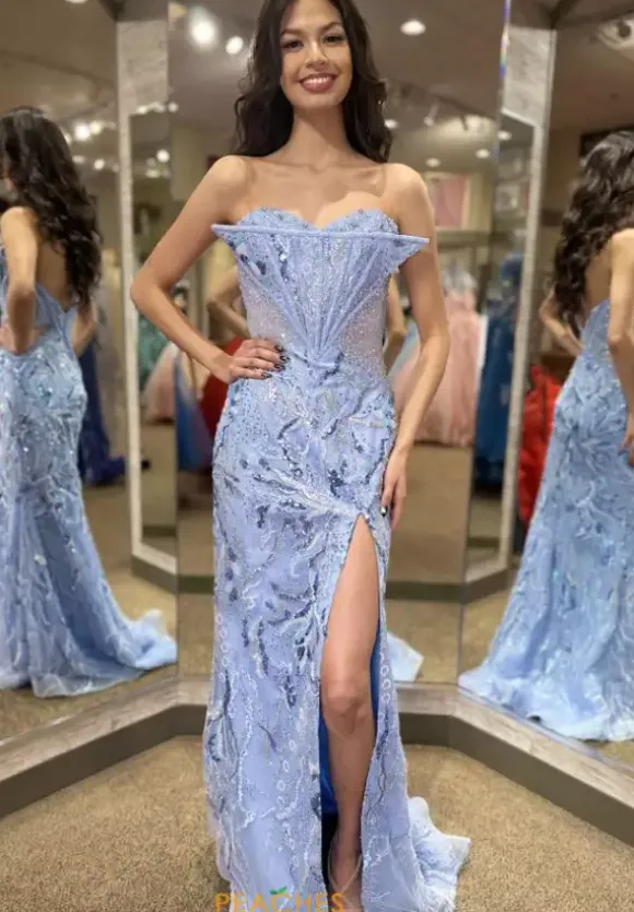 Have everyone wondering where you got your Portia and Scarlett style PS25193. This striking fitted dress showcases a sweetheart strapless neckline with a radiant beaded corset top. The entirety of this fabulous gown is embellished in unique applique and the combination of beads and sequins giving off an everlasting shine.