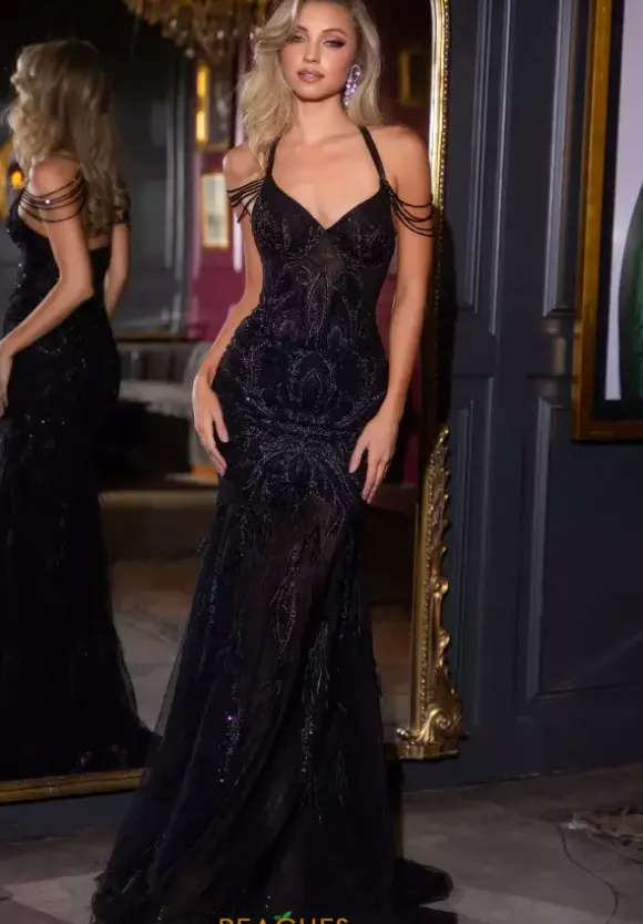 Dramatize your evening wearing the sensational long style PS25212 by Portia and Scarlett. Showcasing the v haltered neckline paired wit delicate fringe cap sleeves that dangle perfectly over the arms. Intricate beadwork and a combination of glistening applique and sequin to offer the perfect amount of shimmer to all your photos.