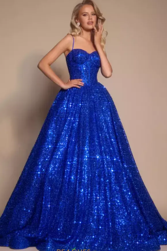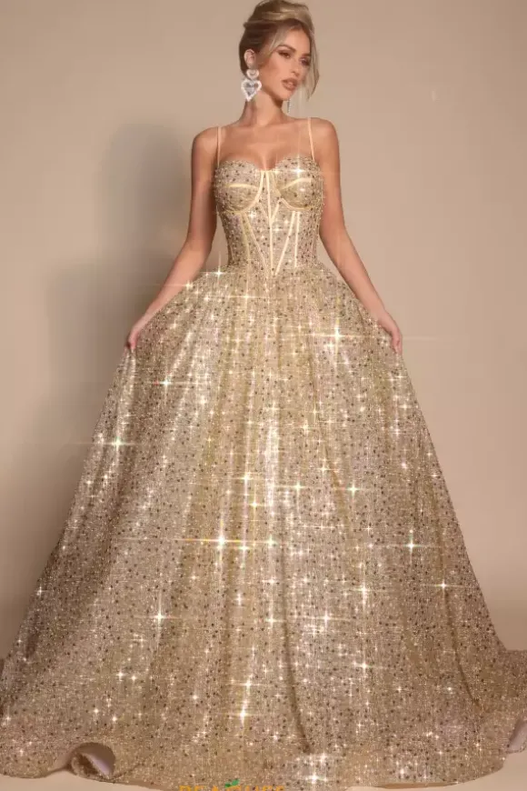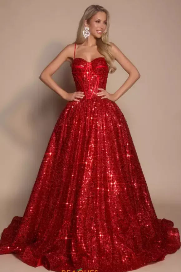 Stand out at your Prom in this Portia and Scarlett modern day princess dress style PS25308 made in completely beaded fabric. This scintillating gown features a structured corset with visible boning, sweetheart neckline, spaghetti straps and mid low zipper closure back. The full ball gown skirt has a yoked V waist and small back train.