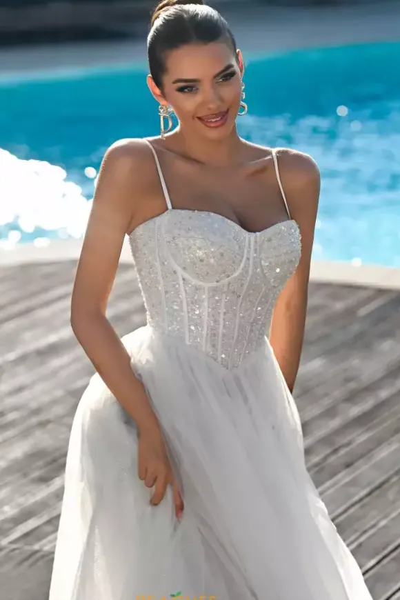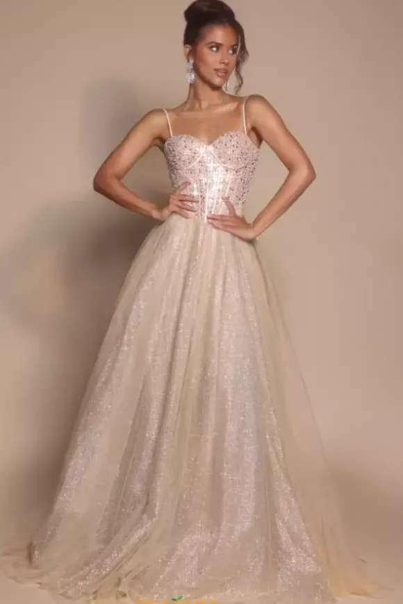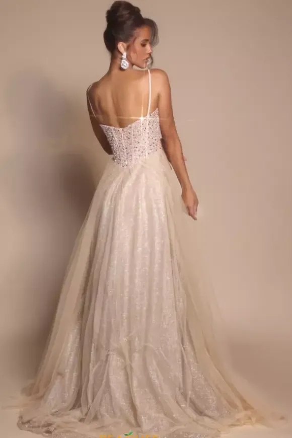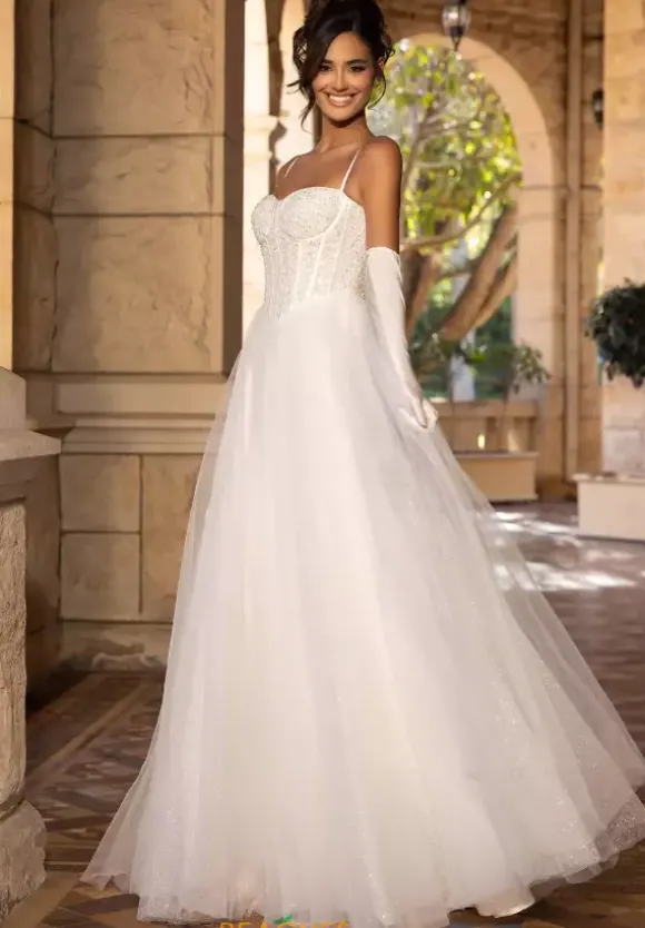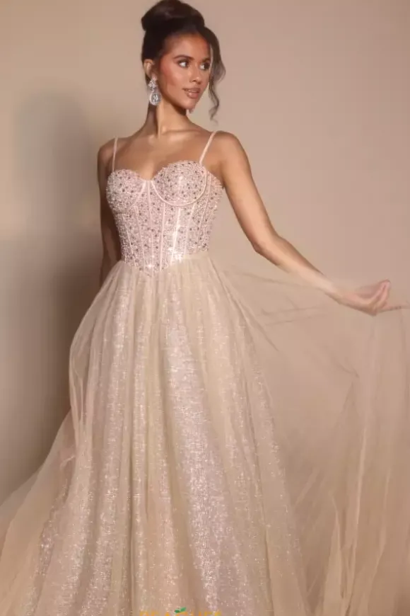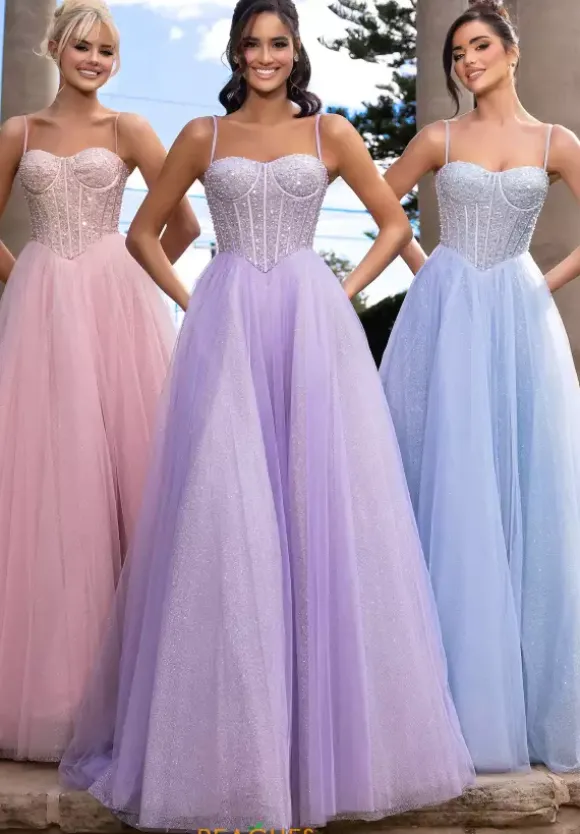 Channel your inner princess for prom and wear this shimmering Portia and Scarlett ball gown style PS25311 made of glistening tulle. Offered in a soft color pallet, this stellar silhouette showcases a completely beaded corset with visible structured boning, a sweetheart neckline, spaghetti straps and mid low zipper closure back. The long, ball gown skirt has flowing tulle layers. Gloves pictured do NOT come with this dress.