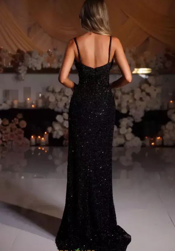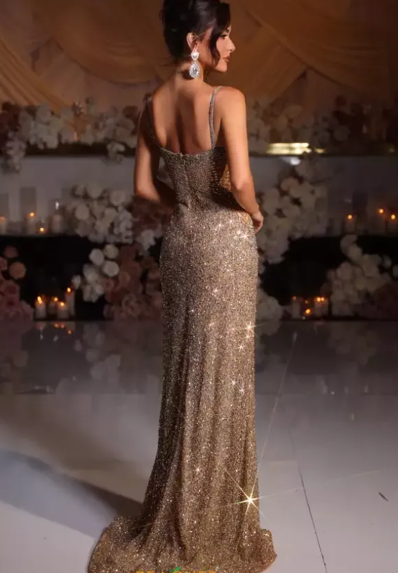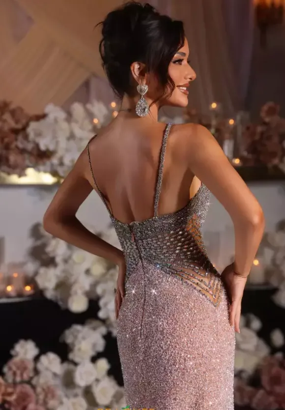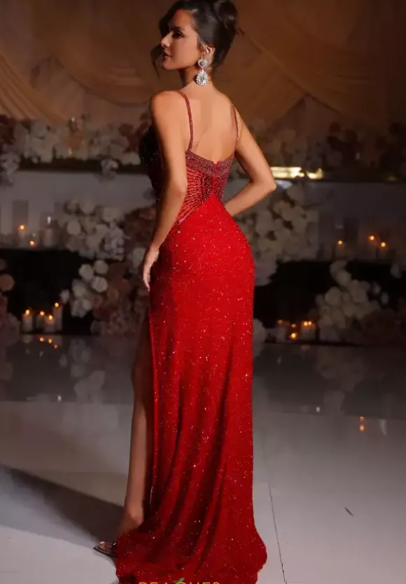 Make jaws drop when making your grand entrance at Prom wearing this gorgeous long fitted dress by Portia and Scarlet style PS25431C. Featuring a plunging V-neckline with mesh and a pair of matching beaded straps that transitions into an eye catching fully beaded bodice and a glistening beaded bottom. Complete your look with a high thigh slit and train.