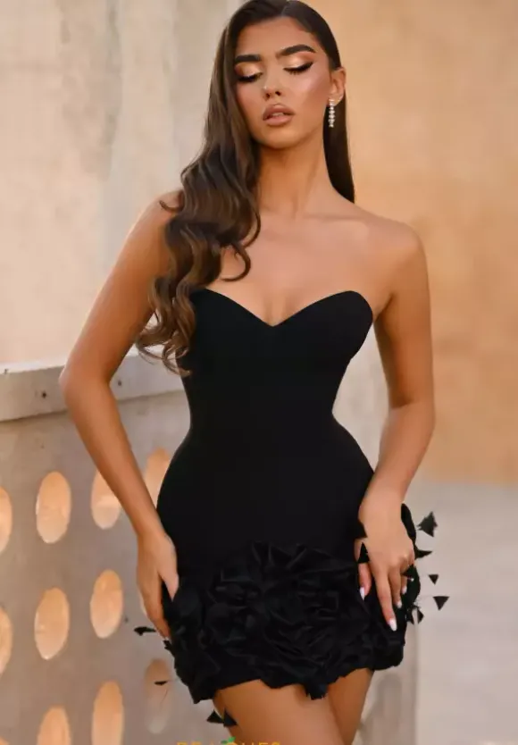 Less is definitely more especially when wearing this classy one of a kind short dress by Portia and Scarlett, style PS25669E. Featuring a fitted silhouette with a strapless sweetheart neckline. This number is made out of novelty material that hugs the body gorgeously. The bottom of the skirt has a beautiful floral design.