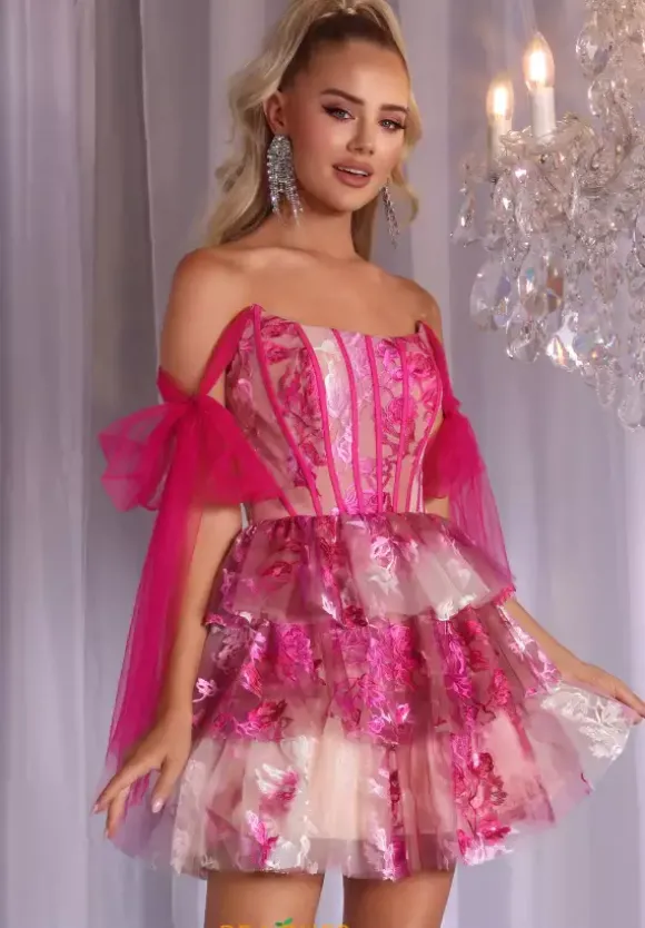 Stand out from the rest when wearing this unique A line style dress made by Portia and Scarlett, style PS25701. This fantastic off the shoulder dress comes in two different color options, including a regular pink shade and a fuchsia/ hot pink. This corset style dress has a phenomenal scoop shaped neckline and is made with gorgeous tulle that will instantly have all eyes on you.