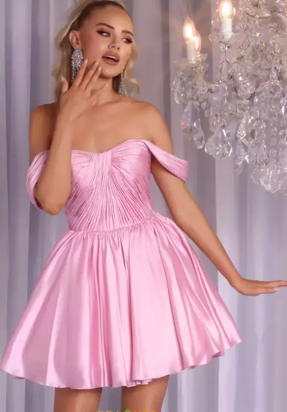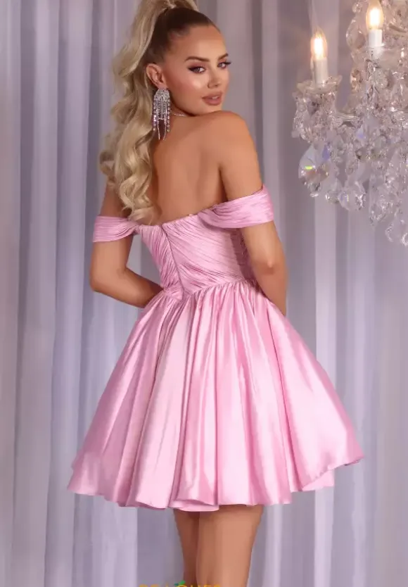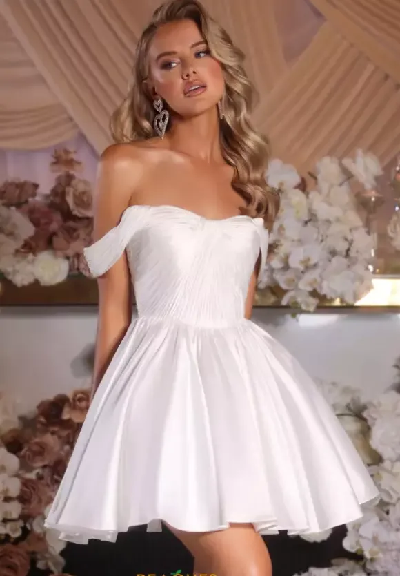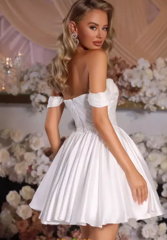 Sweet and elegant is this Portia and Scarlett short a line dress style PS25725. This dress features a scoop neckline bodice with off the shoulder cap sleeves. The bodice is ruched to meet in the center to make it ultra flattering. The satin a line skirt flows from the small of your waist with just the right amount of fullness.