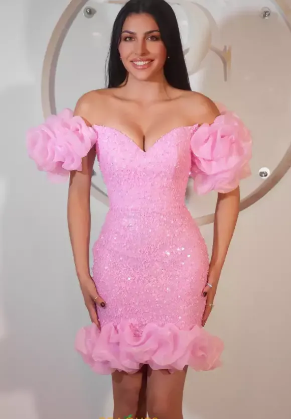Get ready to party in this fun and flirty short fitted dress by Portia and Scarlett style number PS25789. This lovely dress features a timeless off the shoulder sweetheart neckline with large cap sleeves made out of the delicate organza material. The entire dress is made out of stunning beadwork and sparkling sequins.