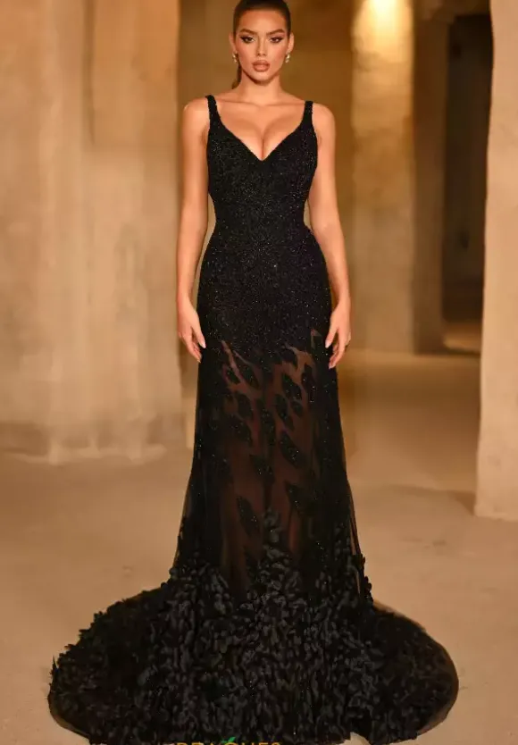 Be picture ready in this fabulous Portia and Scarlett fitted long dress style PS25987C. The sleek fitting dress has a v neckline with thick shoulder straps. The dress lining stop giving you a sheer long skirt that puddles to the floor. Three dimensional appliques escalade from the knees onto the hem.