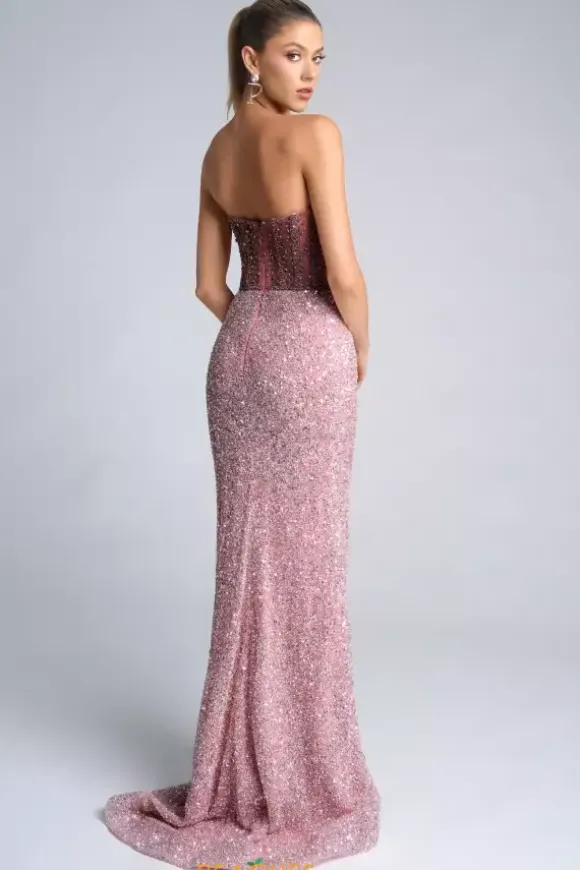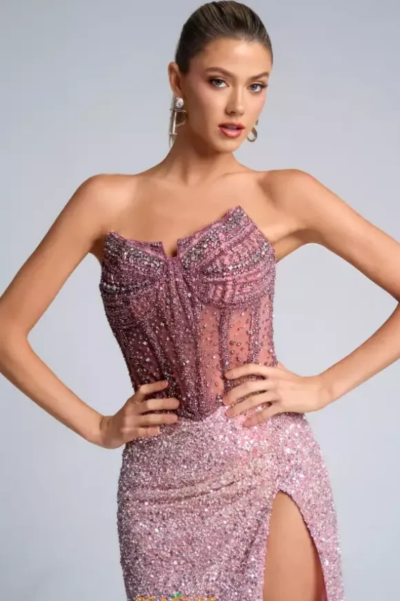 Be the glitz and glam in this all over beaded Portia and Scarlett long dress style PS25990C. This dress will have all eyes on you with the head to toe combination of hand sewn bead work. The strapless scoop neckline bodice is detailed with beading along the boning. The long fitted skirt has a sweep train and thigh high front side slit.