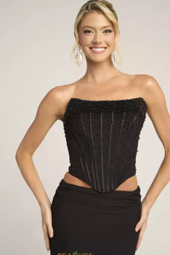 Sleek sophistication exudes when you wear this Portia and Scarlett two piece dress style PS26007. This impeccable ensemble showcases a strapless corset embellished with pearls with visible boning and lace up tie low back. The long slim skirt is made of rich crepe fabric and falls to the floor with a sweep train.