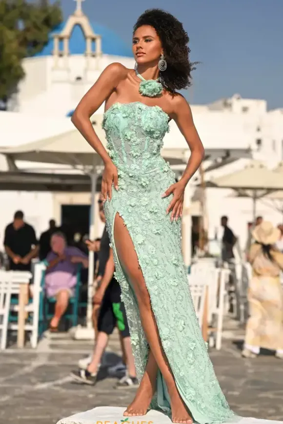 Have all eyes on you at your next special event in this glamorous gown by Portia and Scarlett PS26011. Featuring a strapless fitted corset bodice that will hug your shape beautifully and show off your natural curves. Adorned entirely in a gorgeous beadwork and a touch of floral detail to add a touch of glam.