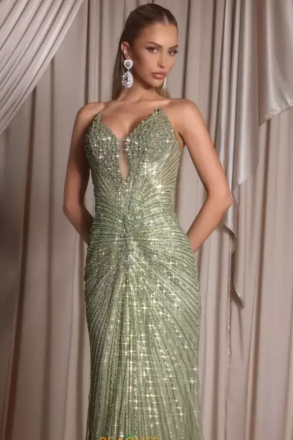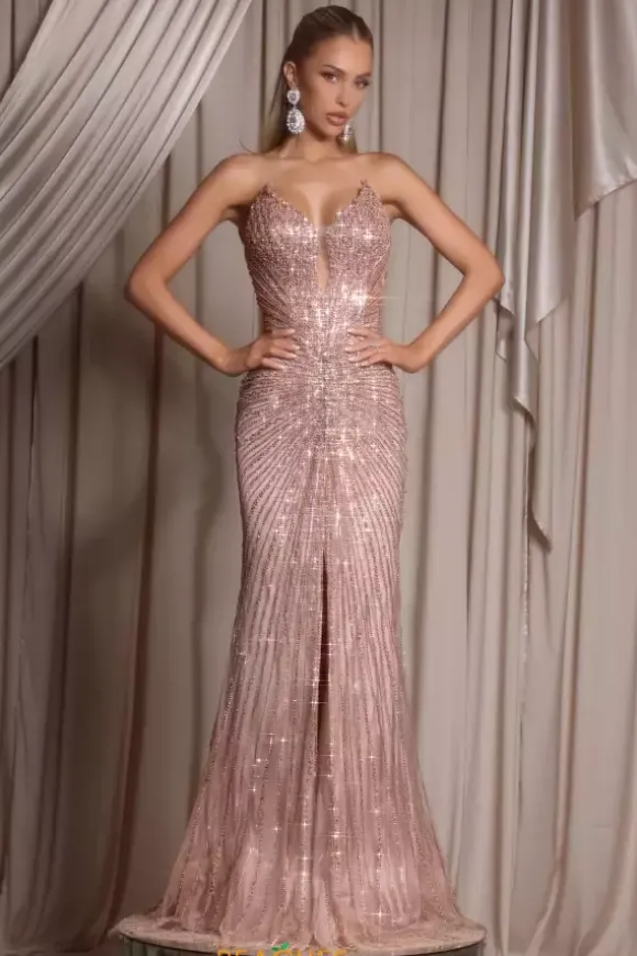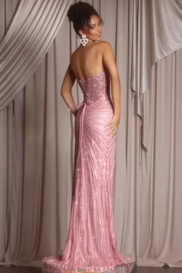 Capture every ones attention at Prom in in this glistening Portia and Scarlett long dress style PS26012 embellished with figure flattering lines of sparkling bead work. This glamorous gown features a lace up back corset with a strapless, V neckline. The long straight skirt flows to the floor with a mesmerizing center front slit.
