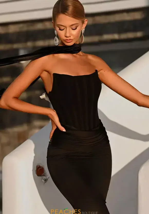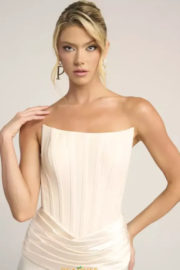 Sleek sophistication exudes when you wear this classic Portia and Scarlett long dress style PS26032 to your next social occasion. Made in rich satin colors, this phenomenal gown features a strapless corset bodice with a scoop neckline, visible boning and V back with zipper closure. The long slim skirt has pleating at the waist and backside ruching.