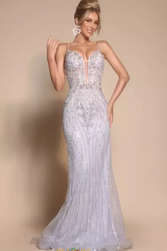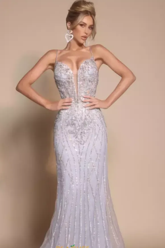 Feel runway ready in this absolute divine long fitted dress designed by Portia and Scarlett style, PS26033. This dress shows a bold deep V neckline and a striking corset lace up bodice, supported with delicate straps. The entire ensemble is fully embellished in magnificent patterns with dazzling beadwork.