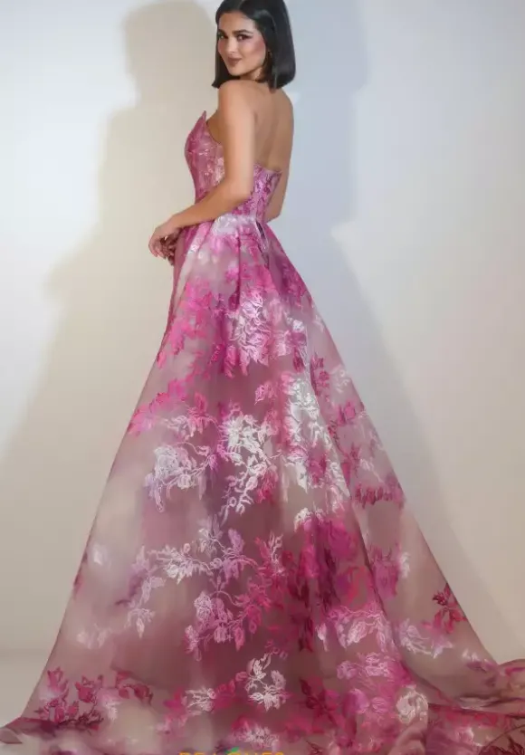 All eyes will be on you when you enter your event in this lovely fitted Portia and Scarlett dress style PS26035. Available only in this novelty pink multi color way, this dress has a deep v strapless neckline. The fitted long skirt peeks through the overskirt that falls from your hips. The front of the skirt has a thigh high side slit.