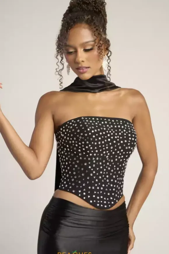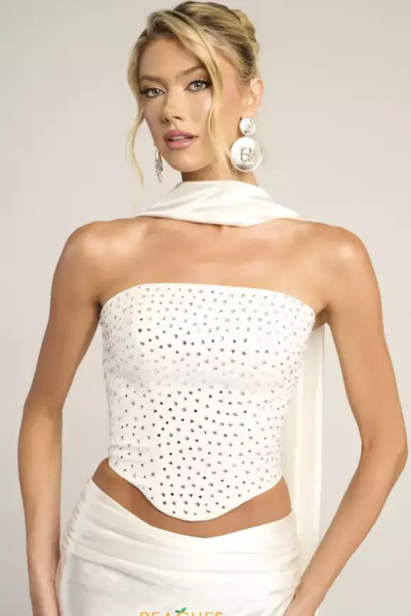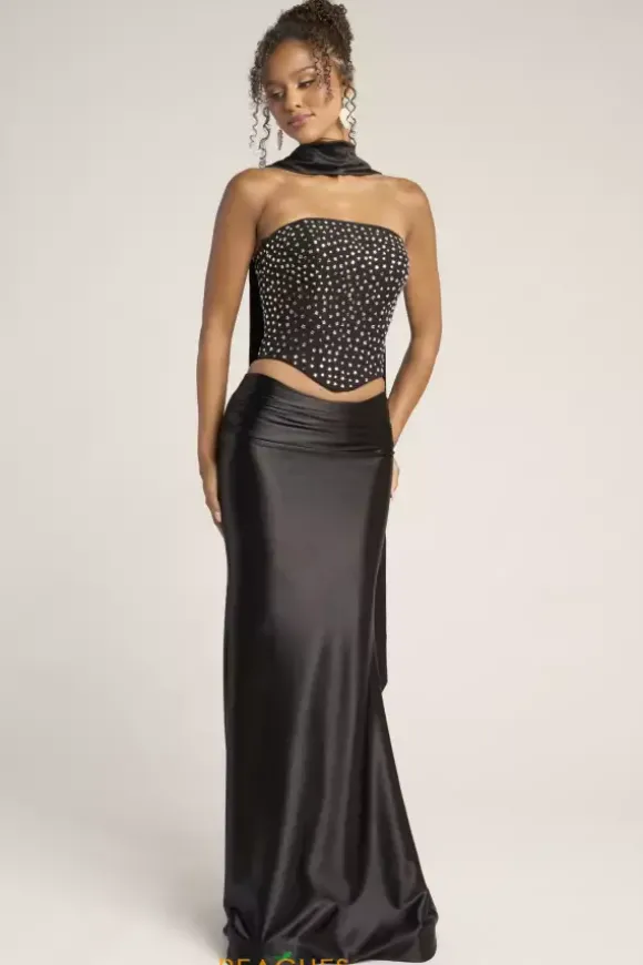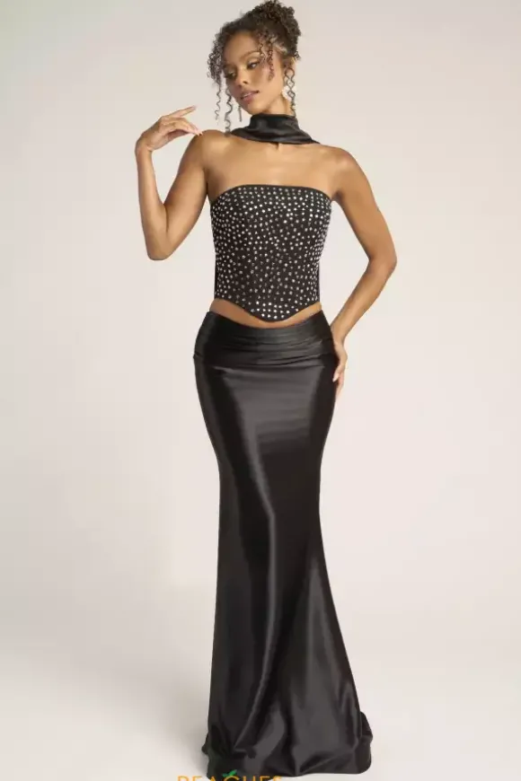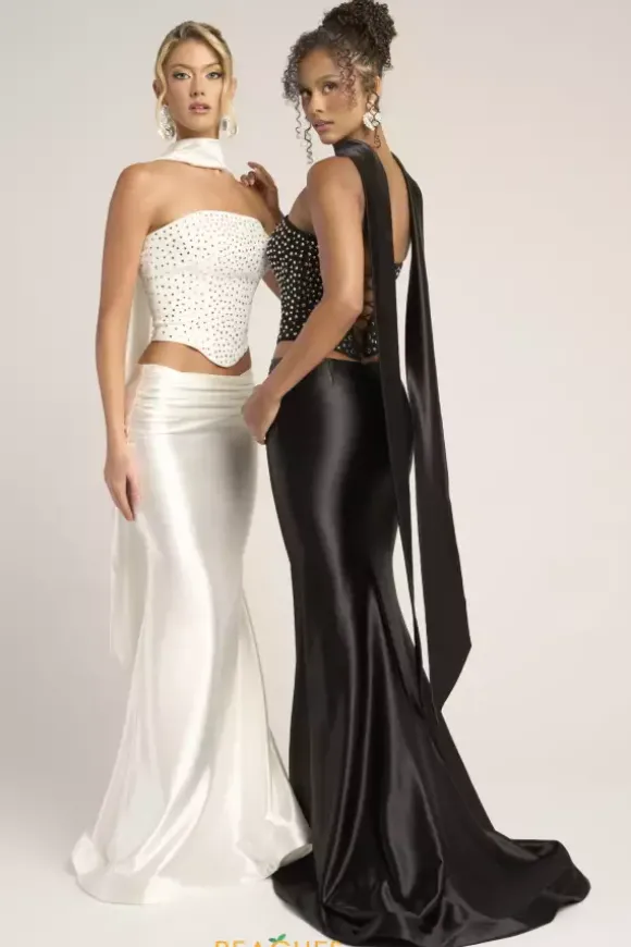 Mesmerize the crowd when they see you in this ultra glamorous fitted two piece dress designed by Portia and Scarlett style, PS26042. Showcasing a strapless beaded corset bodice with a lace up back guaranteed to fit perfectly to your preference. Make a statement with the long all over satin skirt and train.