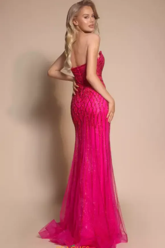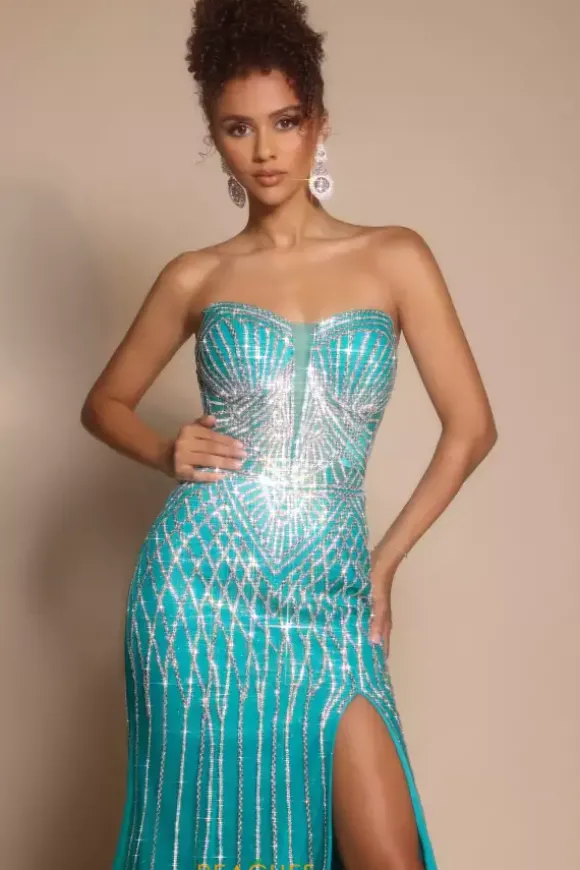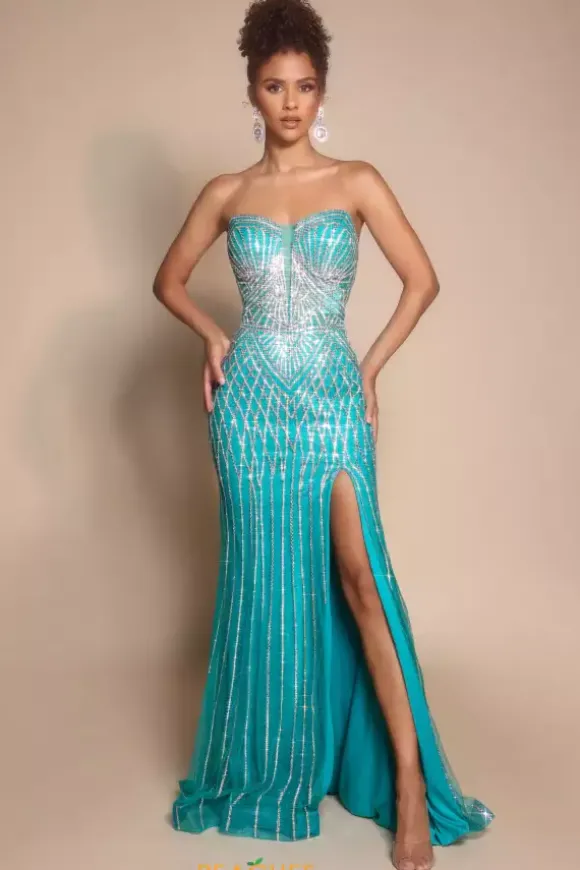 Walk in and strike a pose wearing Portia and Scarlett long dress PS26072. This absolutely striking fitted dress showcases a flattering sweetheart strapless neckline with a full zip up closure unique patterns of intricate beads and sequins add the perfect amount of sparkles ensuring you stand out effortlessly.