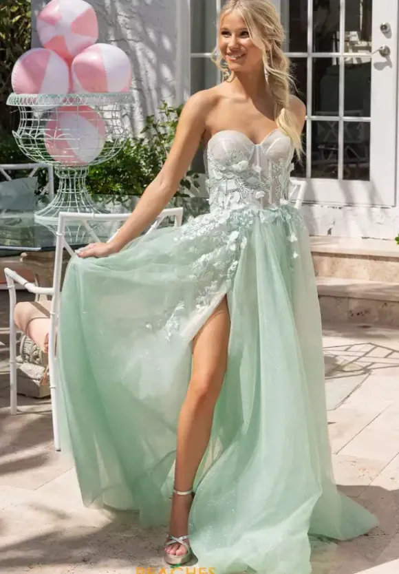 Step out of your comfort zone when you wear this fabulous long A line dress by Portia and Scarlett style PS26078. This bodice features an adorned strapless sweetheart neckline that highlights the beautiful floral applique on the corset. Made in lovely lace and tulle material. The high thigh slit is an absolute must with this dress.