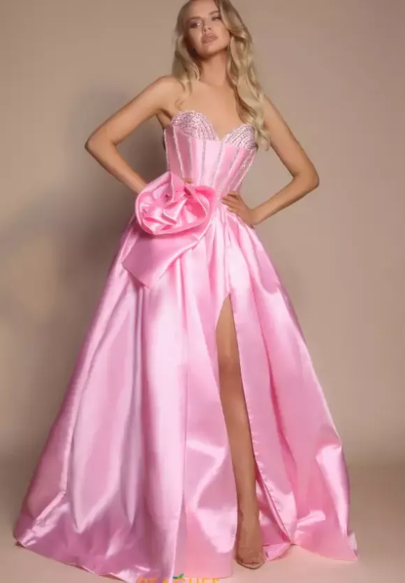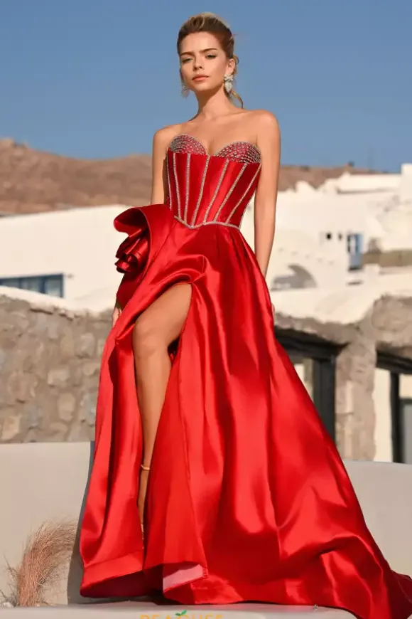 Make a fashion statement when you choose Portia and Scarlett long dress PS26079. This captivating a line silhouette showcases a flattering sweetheart strapless neckline with a touch of radiant beadwork. The figure flattering corset bodice flows into the shiny taffeta skirt revealing a thigh high slit and unforgettable sweep train.