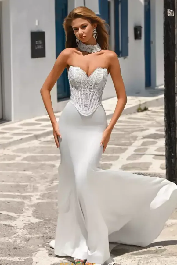 Have a major fashion moment when you go to your next special event wearing this mesmerizing long fitted dress by Portia and Scarlett style PS26086. This body con features a tasteful strapless sweetheart neckline. The corset that will shape your figure is fully detailed in applique and stunning beadwork along with lace. The bottom skirt is made out of jersey material. The long trains finishes the perfect look.
