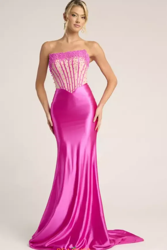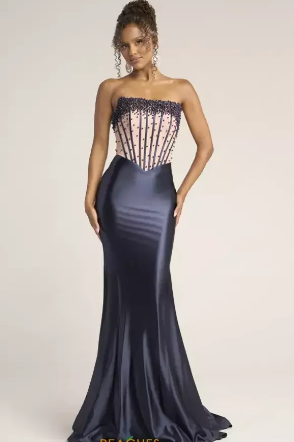 Catch the audiences attention as you wear this dazzling long fitted dress designed by Portia and Scarlett style, PS26094. This fabulous strapless dress showcases a glamorous fitted corset bodice decorated with beautiful beadwork and pearls. The skirt is entirely made up of lovely satin material and reveals a stunning long train.