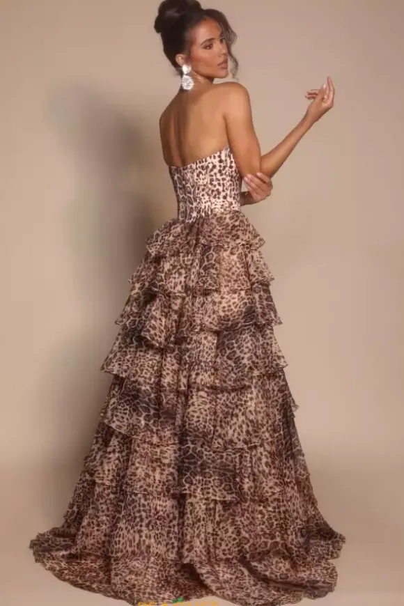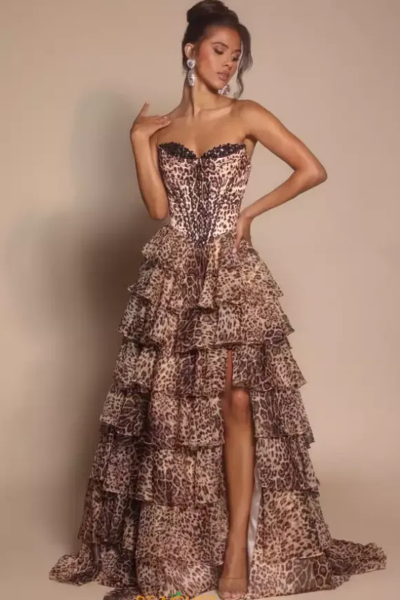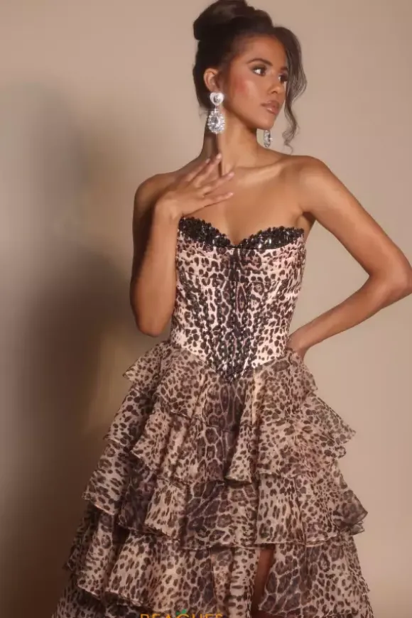 Dare to stand out this prom season in this sleek leopard print Portia and Scarlett A line dress style PS26098. The strapless sweetheart neckline and corset boning are adorned in dainty black beads that perfectly match the rosettes of the leopard print. The fitted corset cinches your waist while the flared chiffon skirt accentuates your hips.