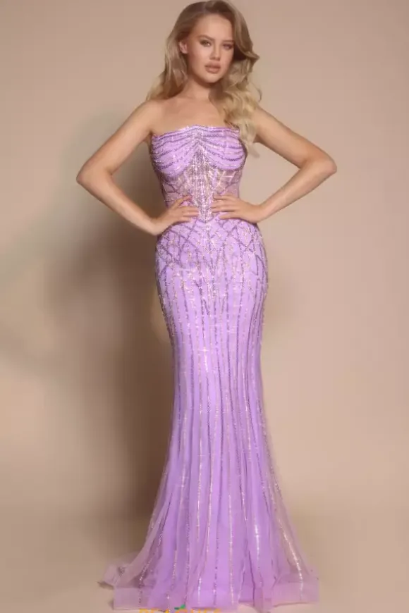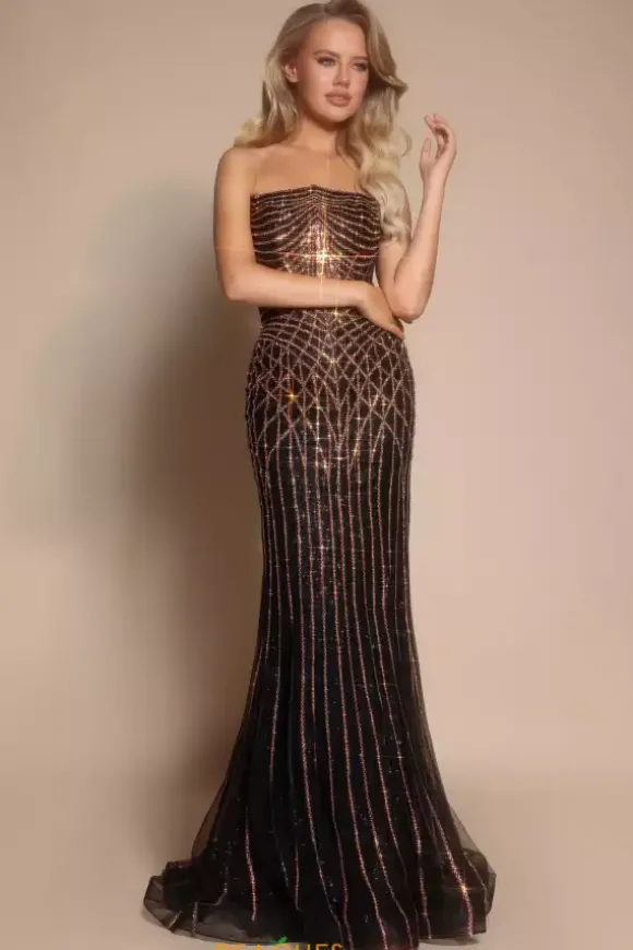Feel like your are walking the red carpet while wearing Portia and Scarlett long dress PS26130. This absolutely striking fitted dress showcases unique strapless neckline with a full zip up closure. Stand out effortlessly with the all over intricate patterns of dazzling and radiant sequins adding the glitz and glam.