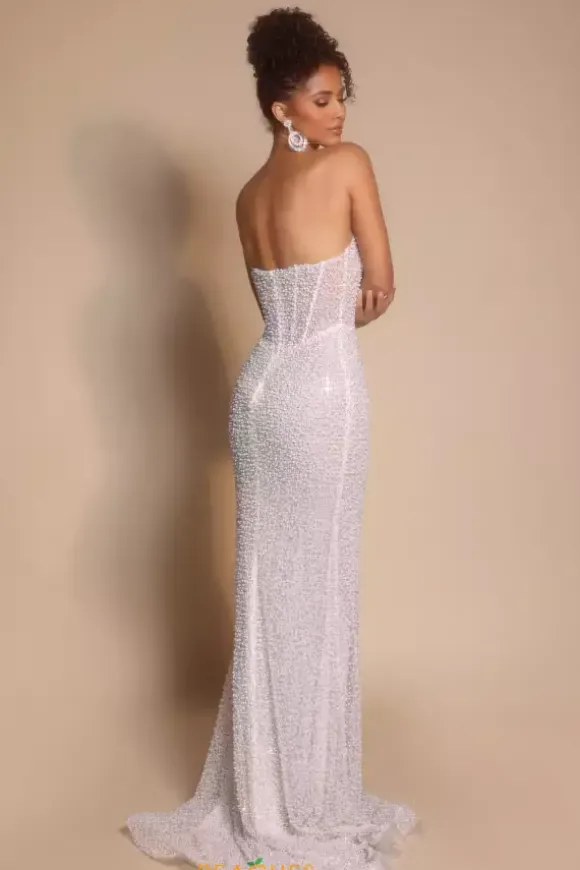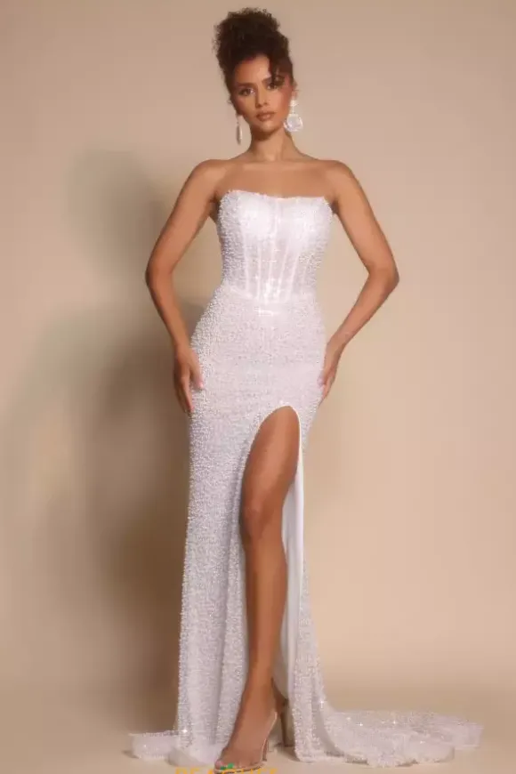 Look and feel your best wearing Portia and Scarlett long dress PS26173 at your special occasion. This striking fitted dress showcases a flattering scoop strapless neckline paired with an accentuating corset bodice. Completely embellished with dazzling beads and trendy pearls, this style finishes with a slit and sweep train.