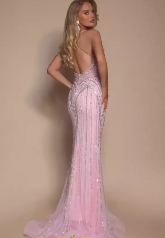 Look fabulous at prom in this scintillating Portia and Scarlett long dress style PS26178 embellished with slimming lines of sparkling bead work. This impeccable gown showcases a fitted bodice with a scalloped V neckline with illusion insert, thin beaded straps and low open back. The long straight skirt has a front, side slit and back sweep train.