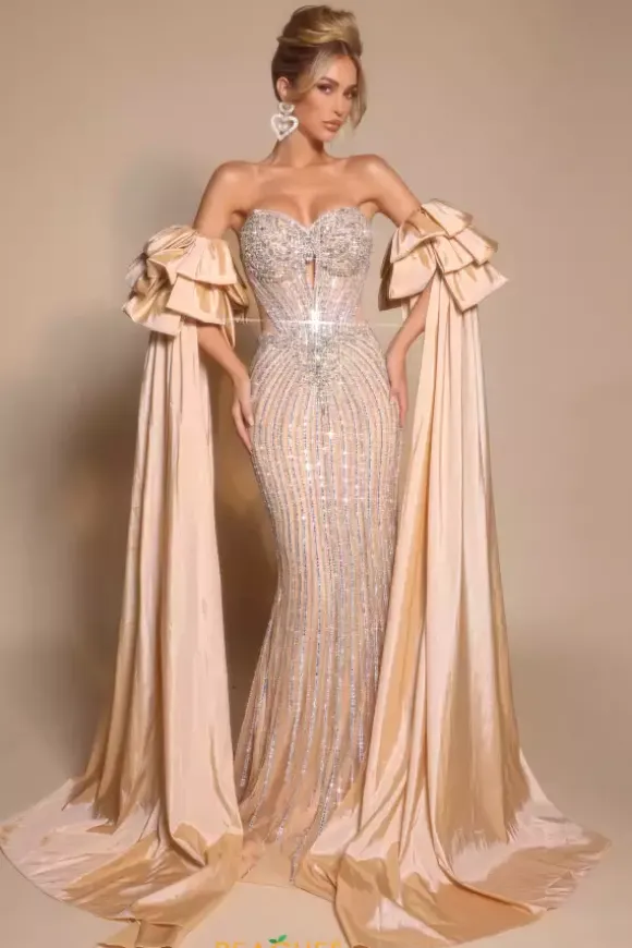 Amp up the drama at your next social occasion wearing this sophisticated Portia and Scarlett long dress style PS26195. This glamorous gown is encrusted completely with sparkling bead work and showcases a strapless fitted bodice with a sweetheart neckline, front cut out and zipper closure low back. Add the draping off the shoulder sleeves sold separately as style PS26195SL for extra flair. The long slim skirt flows to the floor.
