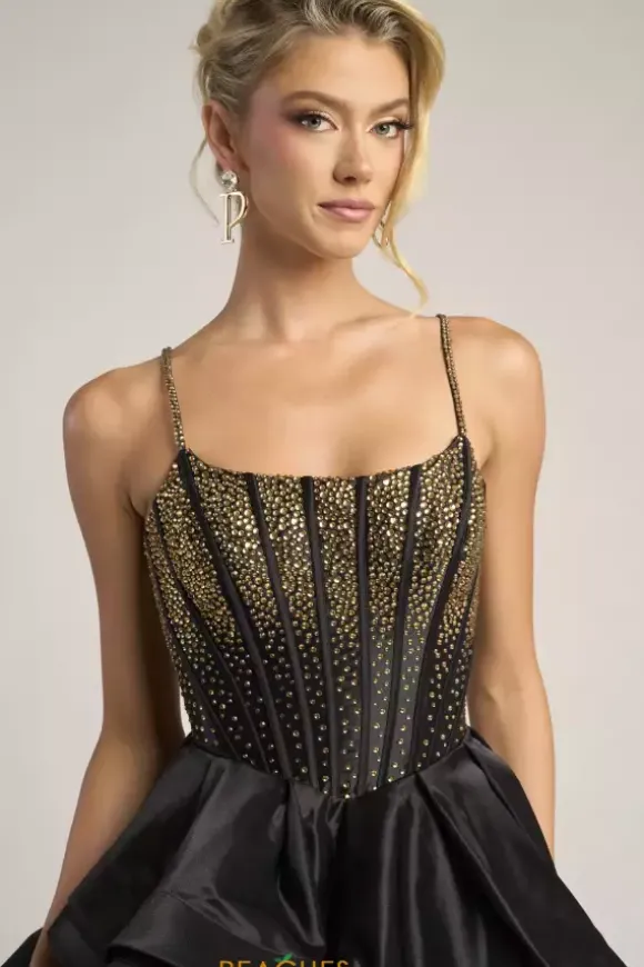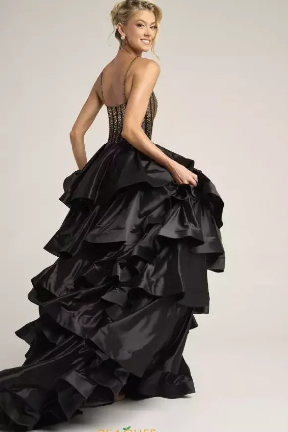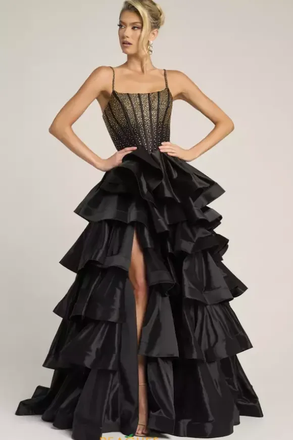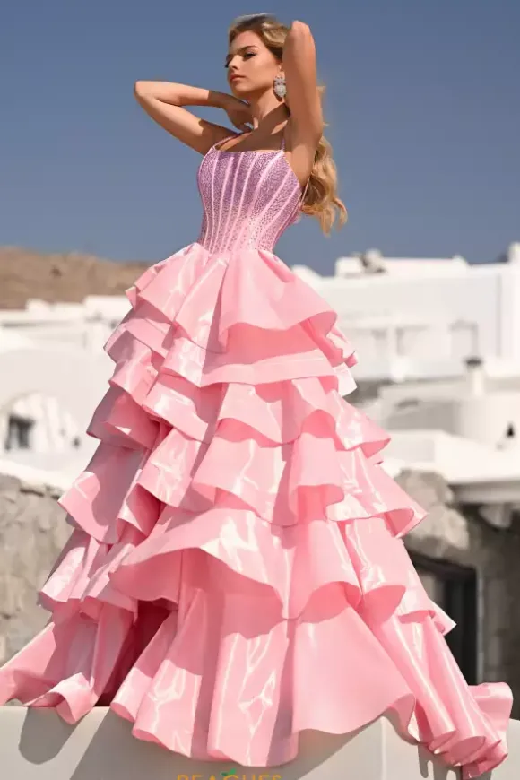 Feel like a modern day princess in this enchanting Portia and Scarlett gown, style PS26253. This dress features delicate straps that beautifully complement the scoop neckline. The fully beaded bodice showcases a corset with visible boning that perfectly hugs your silhouette. The skirt flares out with dramatic cascading ruffles and a daring thigh high slit, creating a truly unforgettable look.