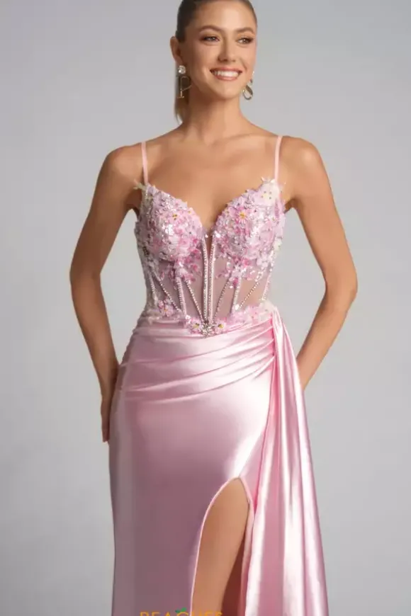 Radiate in this sleek Portia and Scarlett long fitted dress style PS26270. The bodice of this dress has a v neckline corset inspired bodice with multi color floral inspired appliques. The waist line is sheer leading to a long fitted satin skirt. A side train hangs from your hip right above the thigh high front side slit.