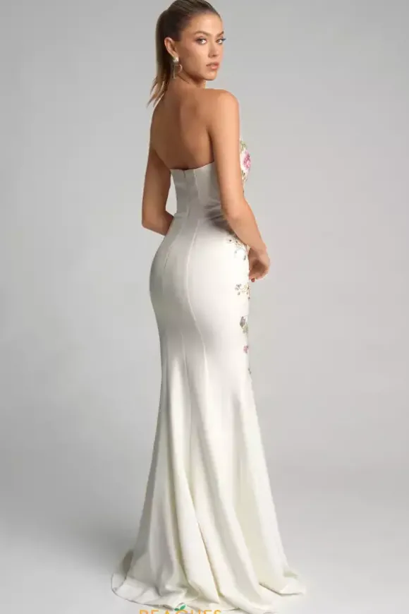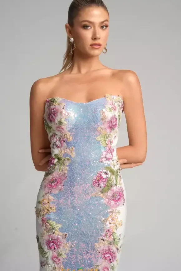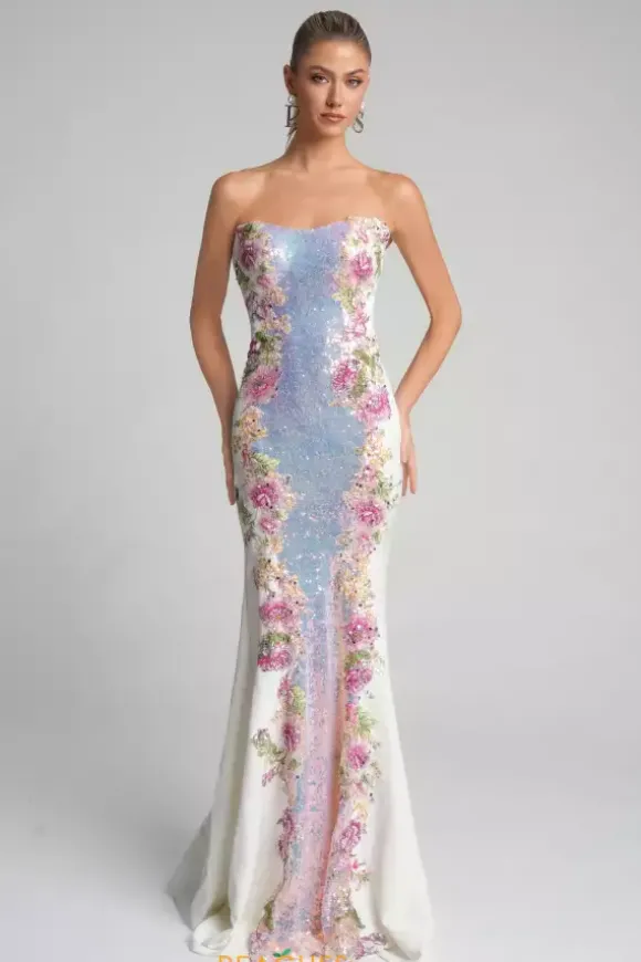 Look picture perfect at prom in this breathtaking Portia and Scarlett long dress style PS26286 adorned with floral embroidery, appliques, beads and sequins. This sensational silhouette showcases a strapless fitted bodice with scoop neckline and low zipper closure back. The long, straight skirt flows to the floor with a back sweep train.