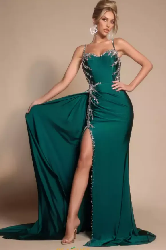 Perfect for any social occasion, this brilliant Portia and Scarlett long dress style PS26304E is made in rich colors of jersey fabric with beaded embellishments along the sides. This impeccable gown features a fitted bodice with beaded spaghetti straps, sweetheart neckline and mid zipper closure back. The long slim skirt has beaded trim along the slit, a draping overskirt on one side and back sweep train.